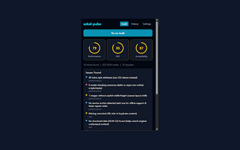 azkal-pulse ist ein kostenloses Chrome-Add-on, das eine sofortige Analyse von Webseiten hinsichtlich Leistung, SEO und Barrierefreiheit ermöglicht. Mit nur einem Klick erhalten Benutzer detaillierte Bewertungen in diesen drei Kategorien. Die Analyse umfasst wichtige Aspekte wie DOM-Größe, render-blockierende Skripte, Metadaten und die Zugänglichkeit von Inhalten. Zudem bietet das Tool Vorschläge zur Behebung von Problemen, die auf KI basieren, und ermöglicht das Speichern von Audit-Historien sowie den Export von Ergebnissen als PDF.